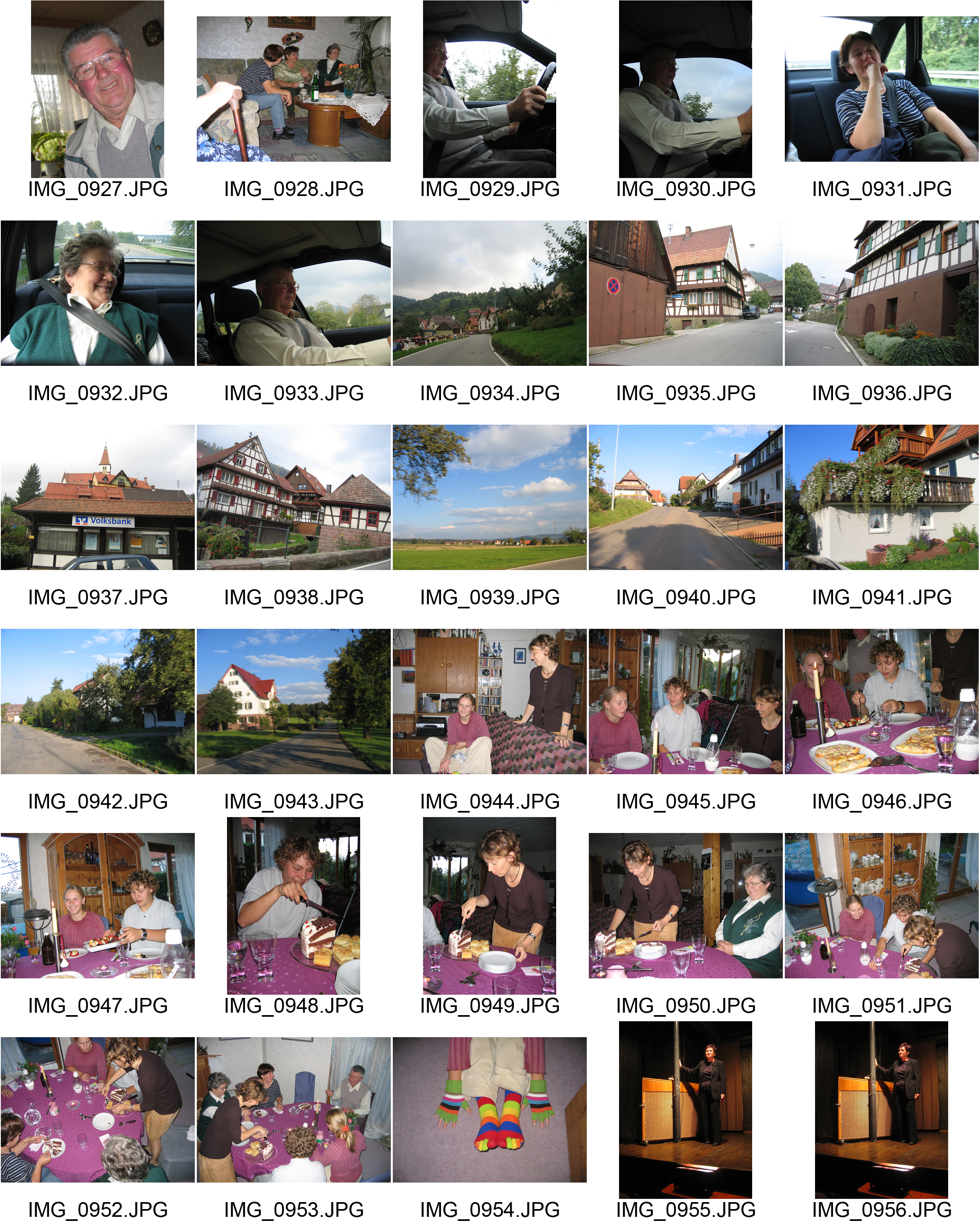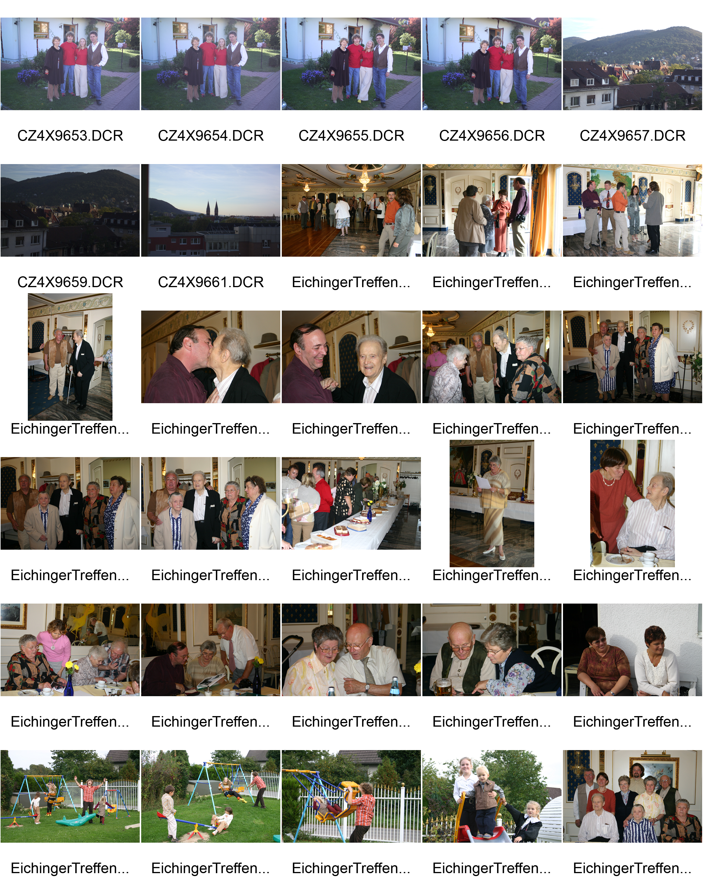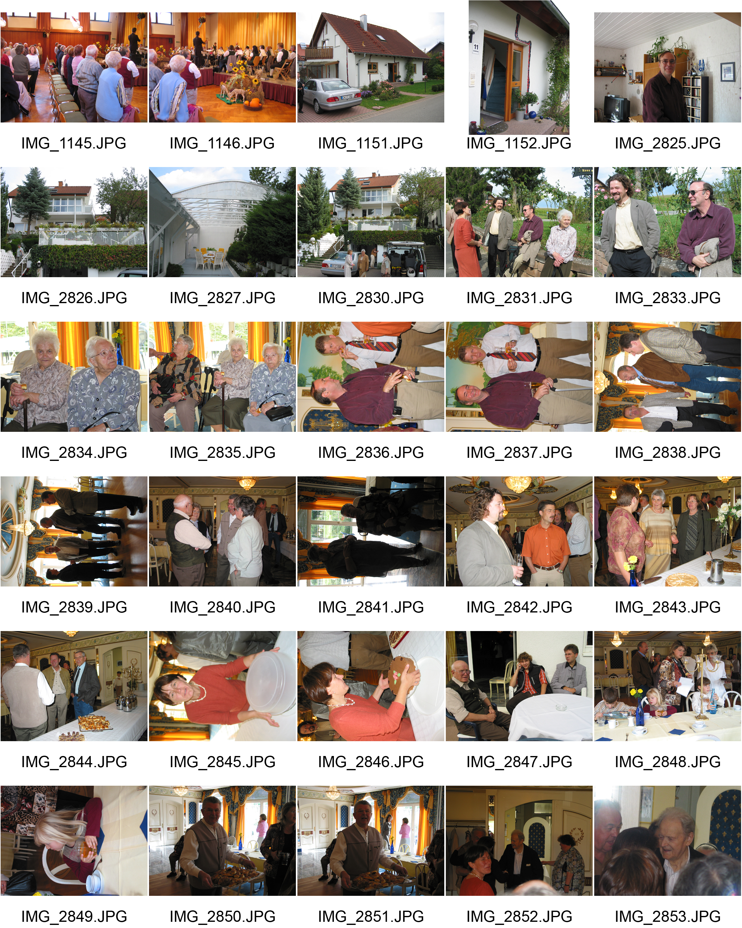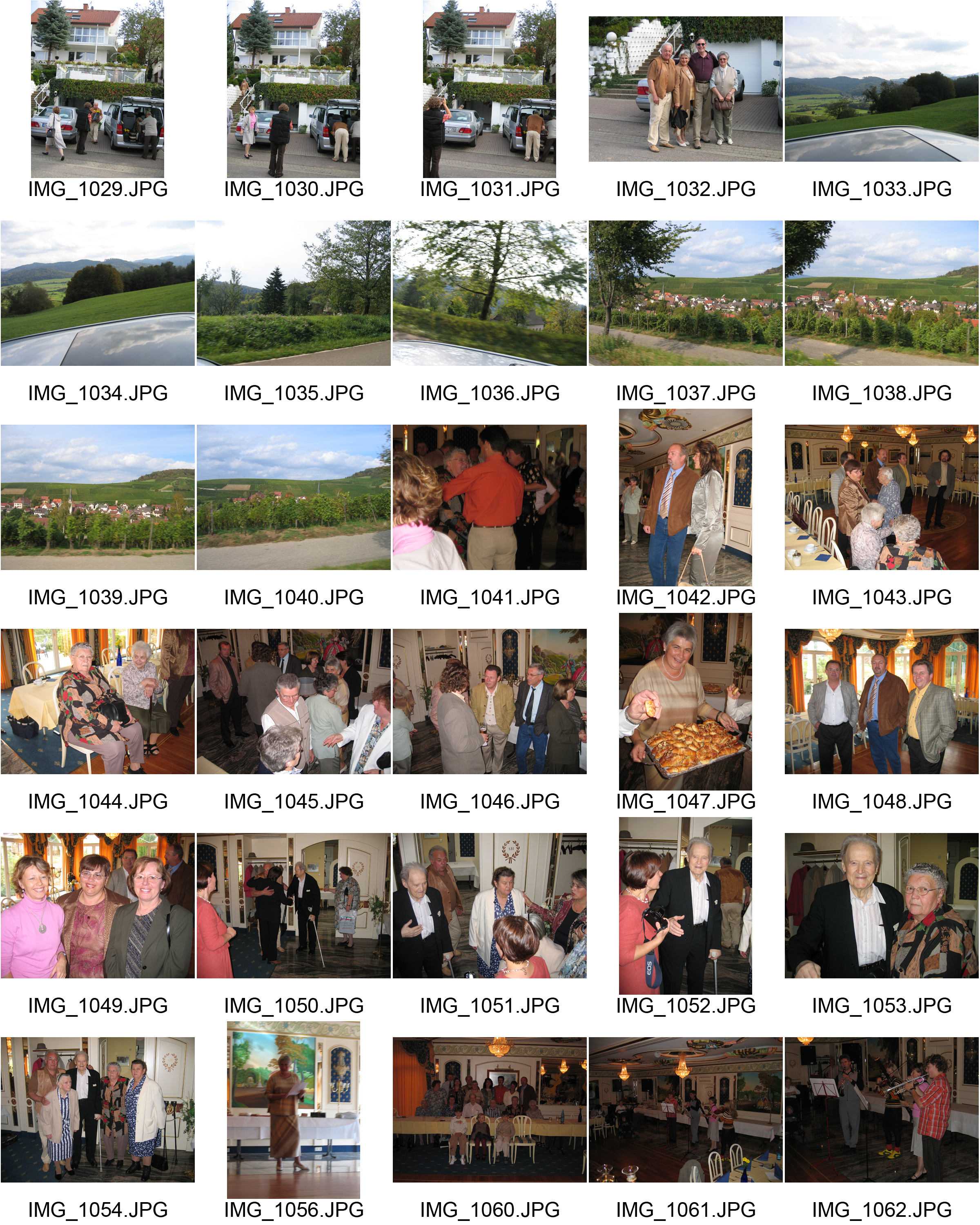 Below are links to three web based pages with all the photos I took trhoughout my four days in Germany, as well as those contributed by other family members. Also there are links to contact sheets. These are all unedited photos. Exposure and color have not been corrected yet. By each photo in the web based photos and also under each photo in the contact pages is a photo number. If you would like a high resoultion copy of any of the photos, I can copy them to disk and mail them to you or email them to you. Please let me know. If you have additional pictures to share, please email me or send me a disc.